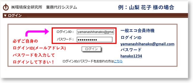 必ずご本人様のログインID(メールアドレス)とパスワードを入力して