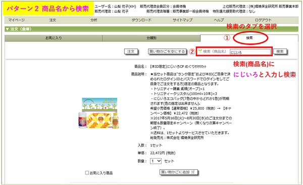 ② 検索(商品名)に、”にじいろ”とひらがなで入力し、検索ボタンを押して下さい。