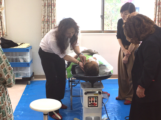 頭皮洗浄の機械を使い、参加者全員交代でモデルさんに