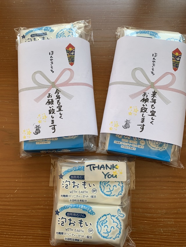 お礼品として泡おもい石けん(4個入)に熨斗を貼ってお渡ししているそうです。