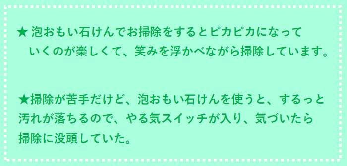 最近では、お客様より、泡おもい石けんを使ってのお掃除体験談を