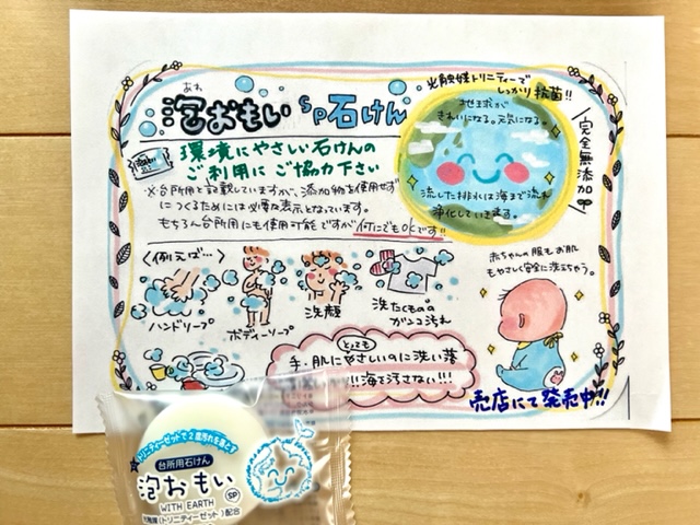 泡おもい石けんと一緒にお客様にお渡ししているそうです。