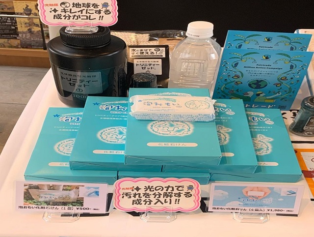 今回フェアトレード商品のPR宣伝を兼ねて泡おもい石けんも一緒に