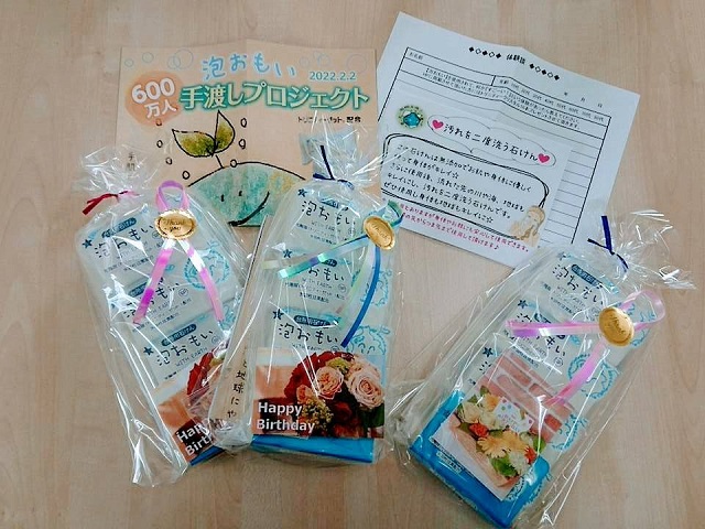 可愛くラッピングされた泡おもい石けんの写真とともに
