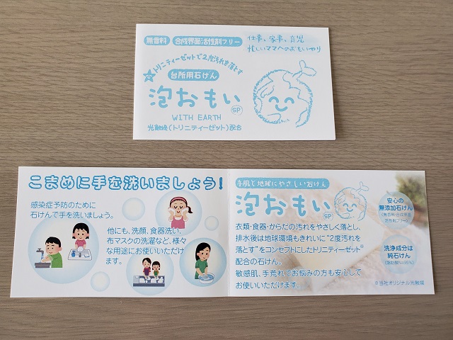 今回泡おもい石けんに同封した2つ折りのサイズのしおりです。