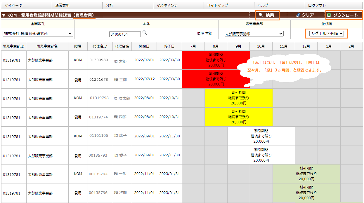 割引適用期間が終了する月が、当月の場合は「赤」、翌月の場合は「黄」、翌々月の場合は「白」、3ヶ月後の場合は「緑」です。「シグナル区分順」でソートし、確認することができます。